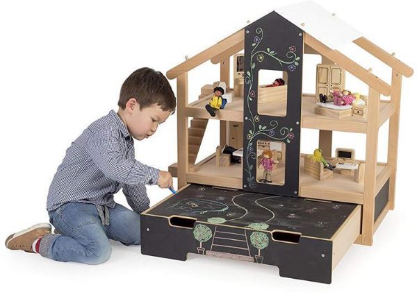 Flot dukkehus klar til leg, inkl møbler, 16 dele. Gør legehuset unik og personligt, ved selv at tegne på det med kridt. Praktisk opbevaring af tilbehør i skuffen under dukkehuset. (Læs mere)